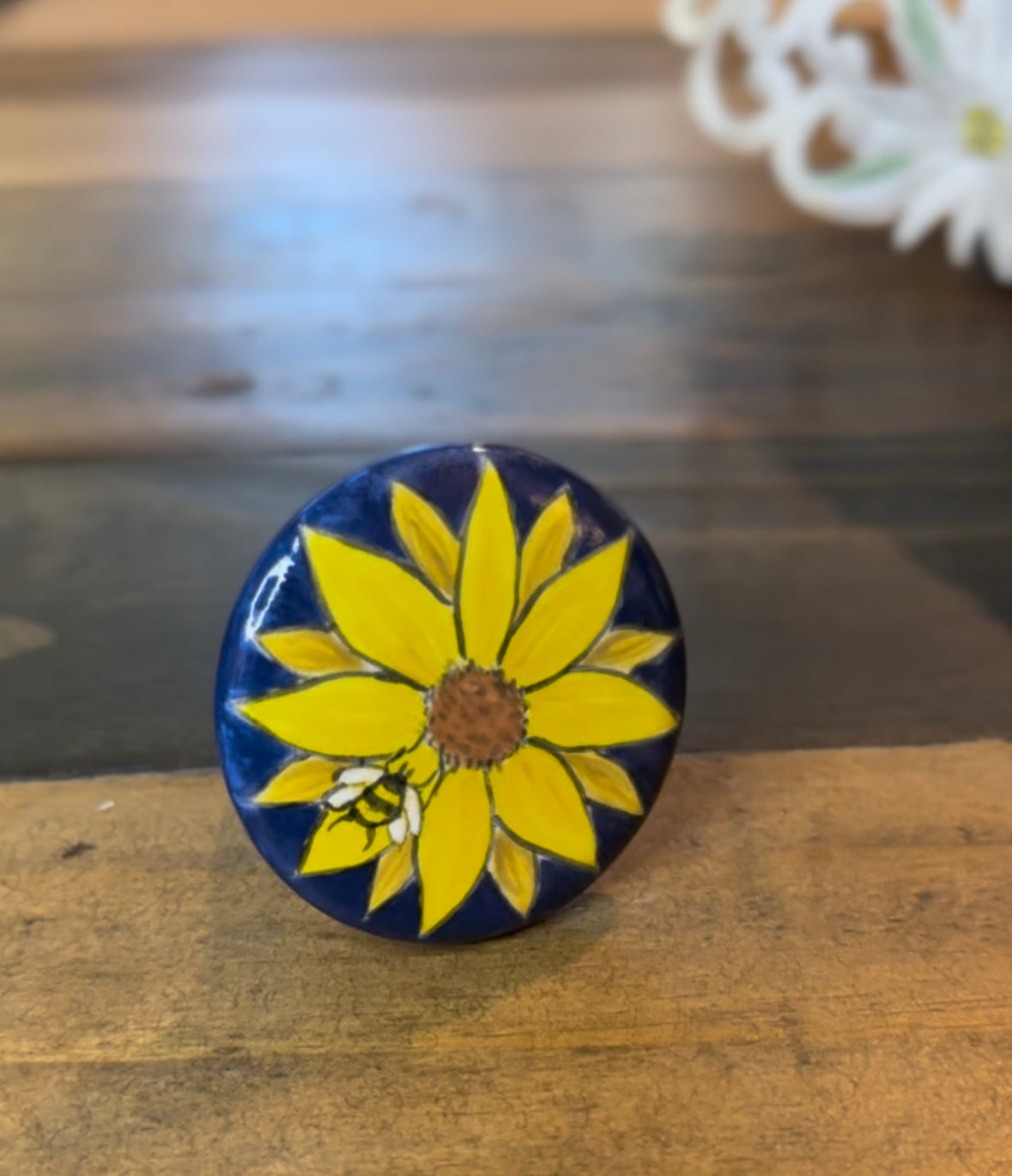 Yellow and blue tableware with sunflower and bee design. Bring some sunshine...