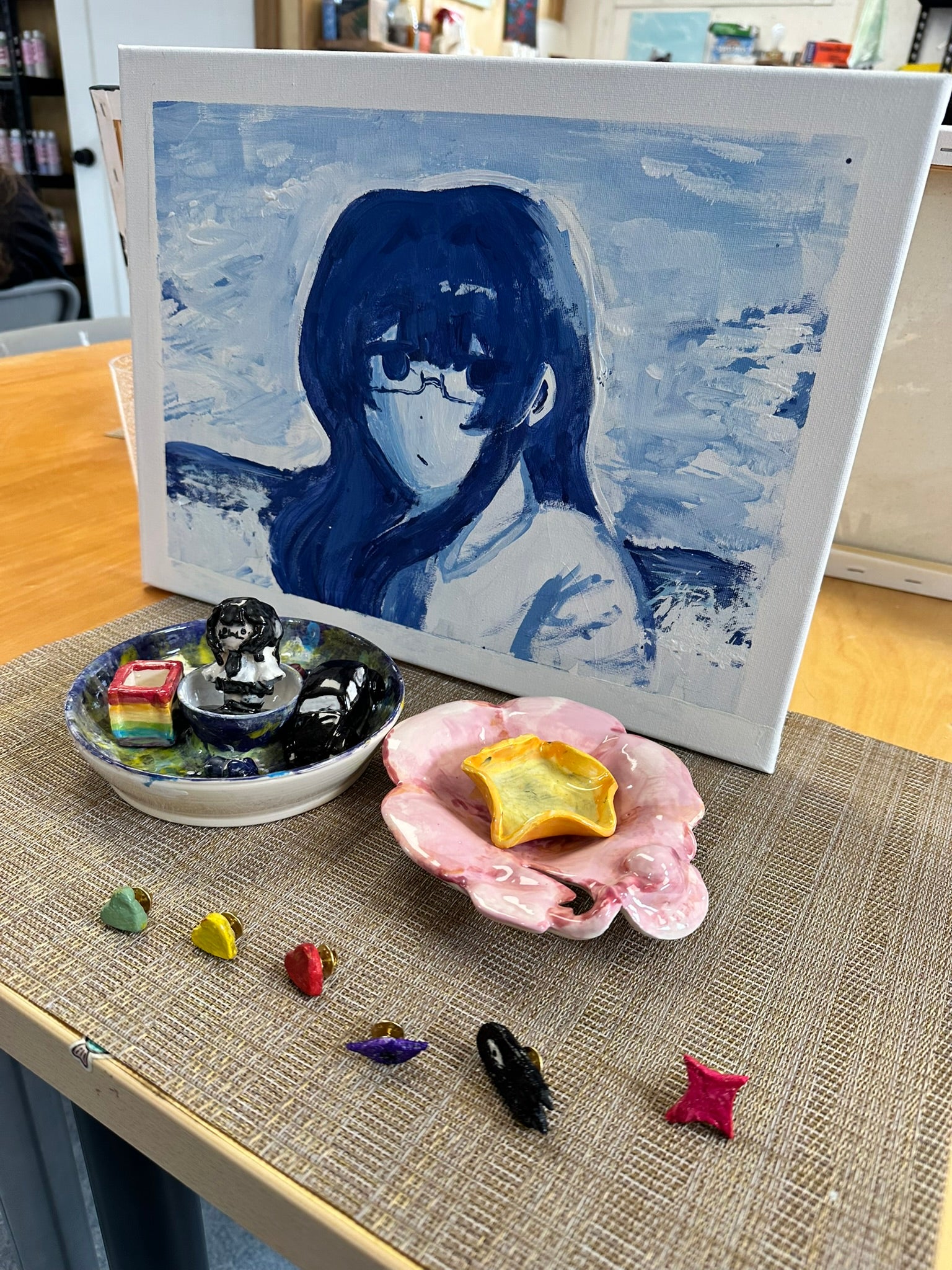 We are lucky to have our own beautiful studio space, as well as a large outdoor area if artists would prefer to spend time working in the sunshine for inspiration. We will provide all materials needed; all that artists will need to bring is a lunch, a water bottle, and comfortable clothes for creating in. At the end of the week, they will bring home multiple pottery pieces (including one they hand-built from clay), a canvas painting, a hand built air-dry pin, and more.