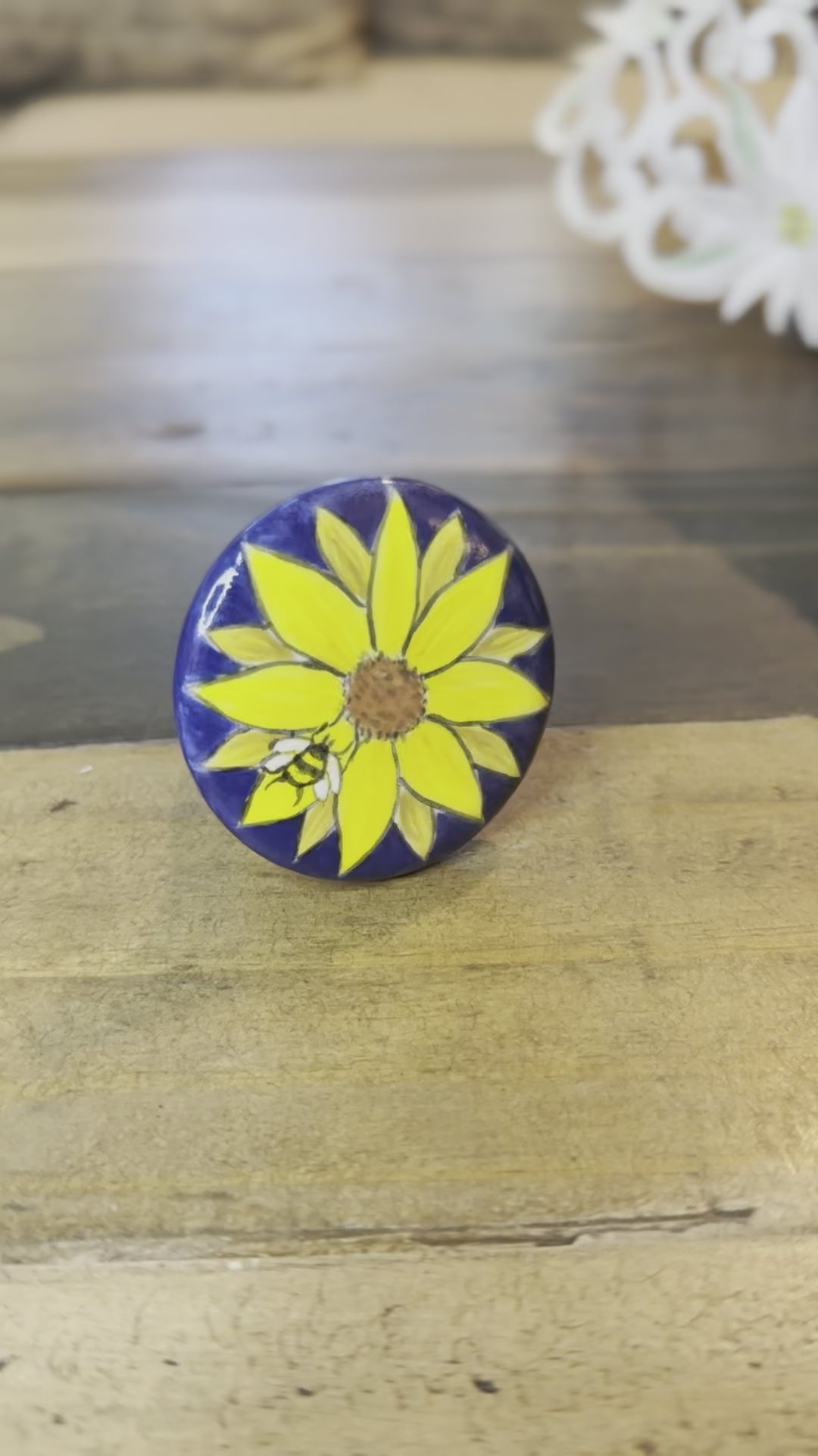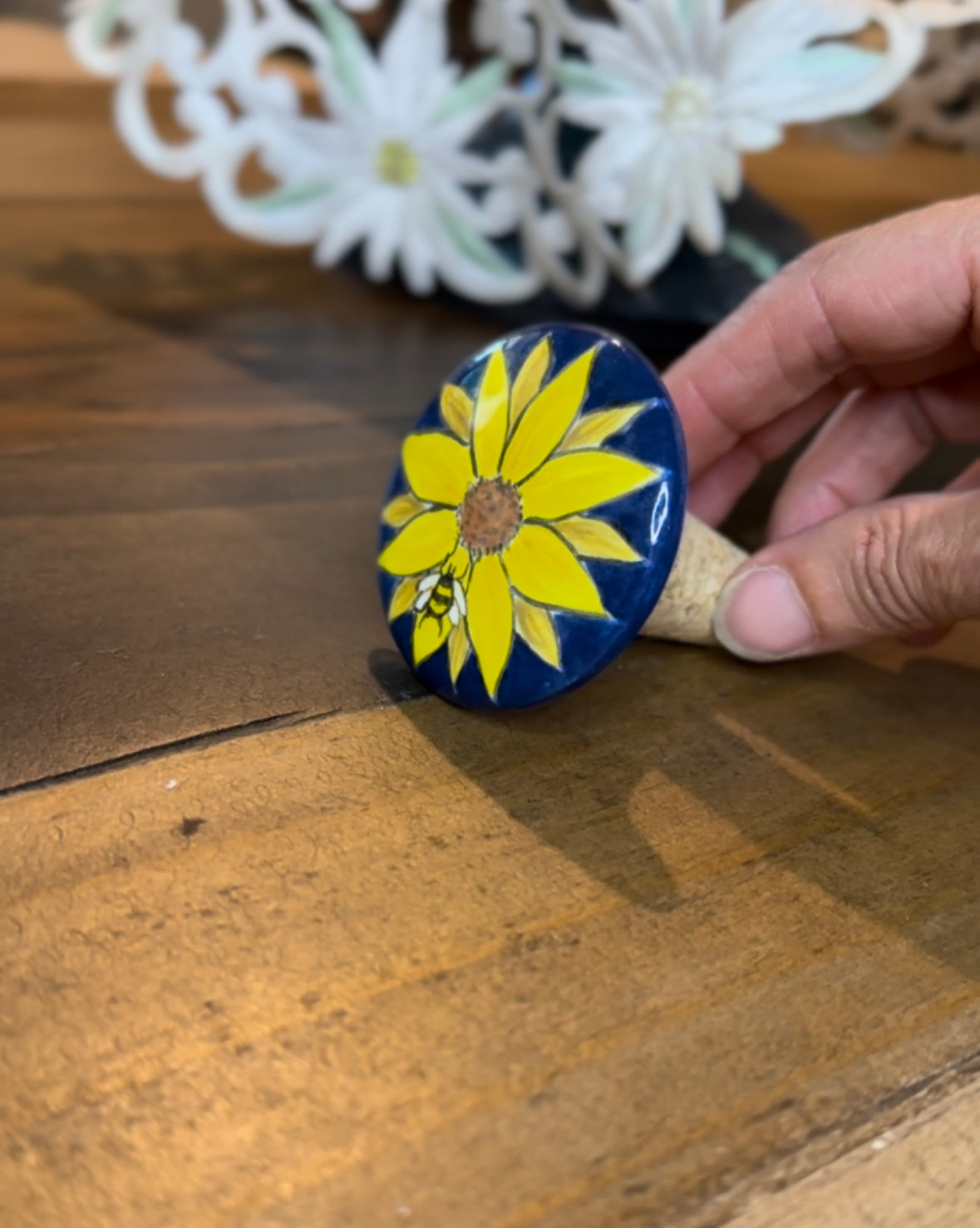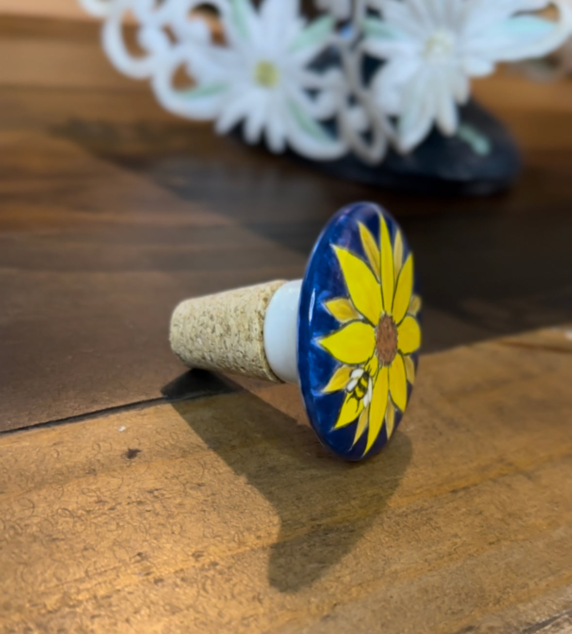 Add a pop of color to your favorite bottle of wine with our hand-painted wine stopper. Featuring a vibrant sunflower and a friendly bee, this ceramic stopper and cork are sure to liven up your day.