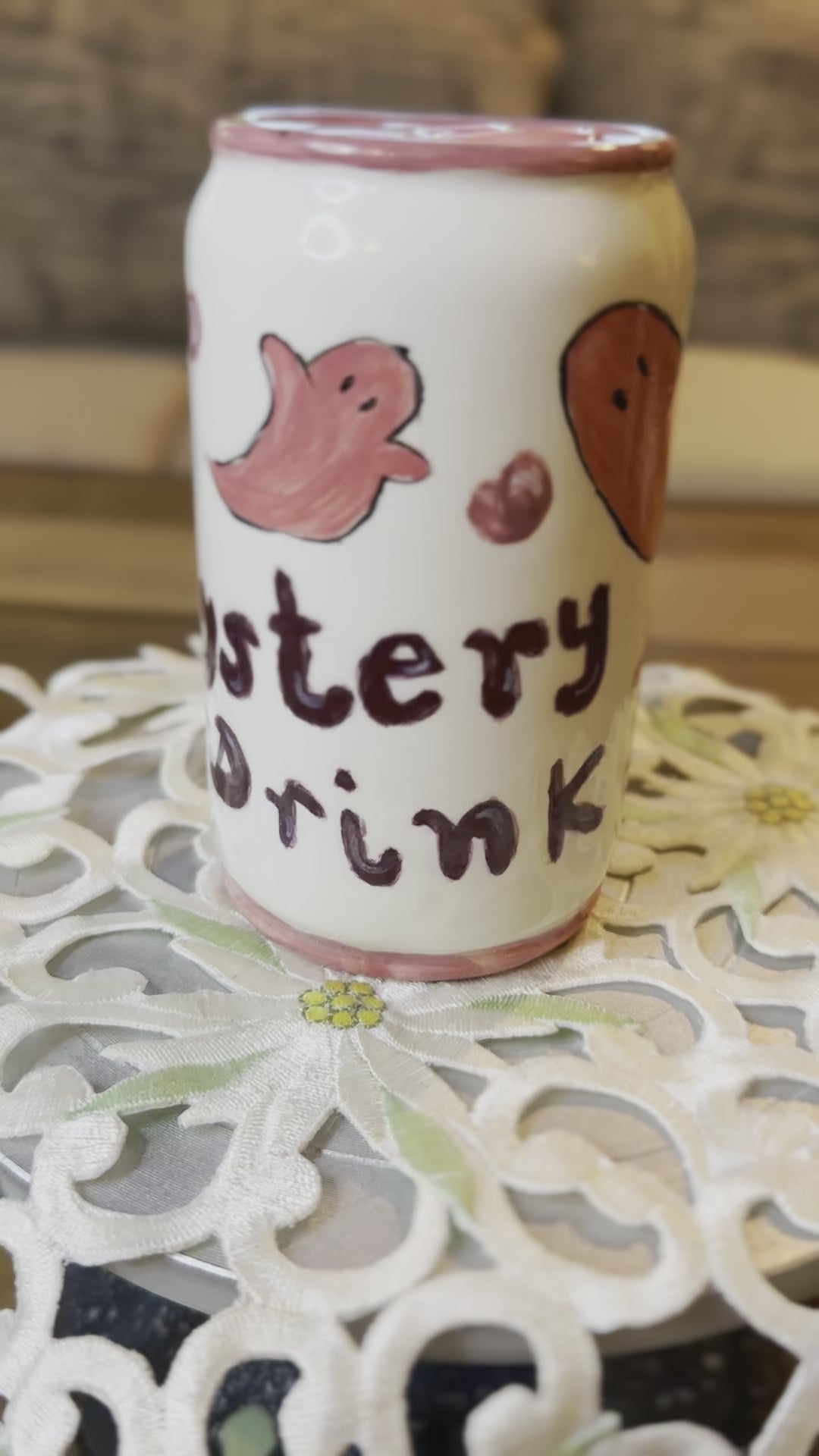 Hand-painted ceramic can for your favorite drinks, featuring our custom Mystery Drink design and friendly ghosts.